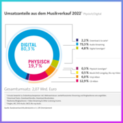 die deutsche Musikindustrie hat 2022 eine wichtige Marke geknackt: 2,07 Milliarden Euro wurden im vergangenen Jahr erwirtschaftet. Zuletzt hat die Branche einen Gesamtumsatz von mehr als 2 Milliarden Euro vor 20 Jahren, im Jahr 2002, gesehen. Besonders der digitale Zuwachs der letzten Jahre stabilisiert und unterstützt das Wachstum im Musikmarkt. Einen Überblick über die Marktdaten 2022 und über die Entwicklungen im deutschen Musikmarkt finden Sie in diesem Newsletter.